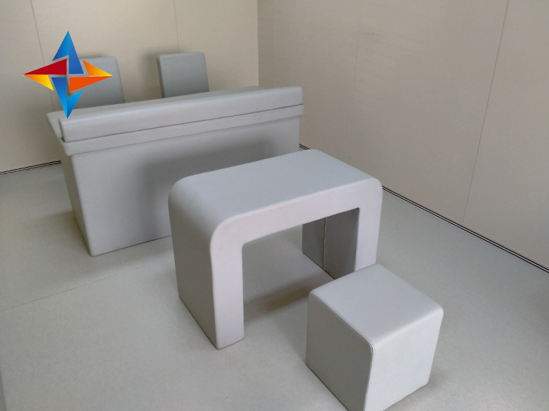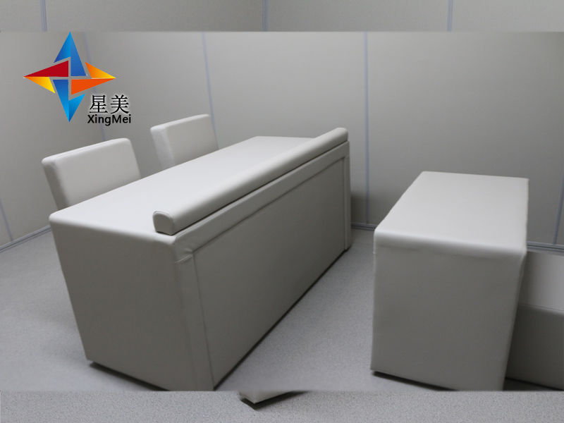 談話室軟包-防火防撞桌椅簽字桌子:尺寸為1000*450*680mm,顏色為黑色,黃色,灰色,由多層實木板+20mm厚的橡膠棉+1mm厚的小荔枝紋阻燃皮革組成,整體功能:防火防撞防火。