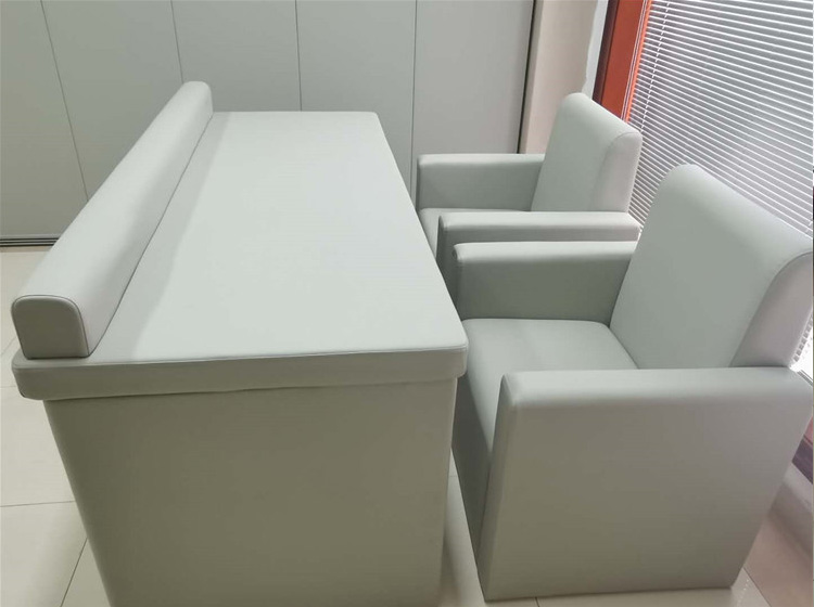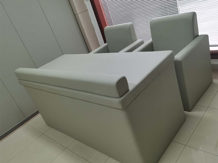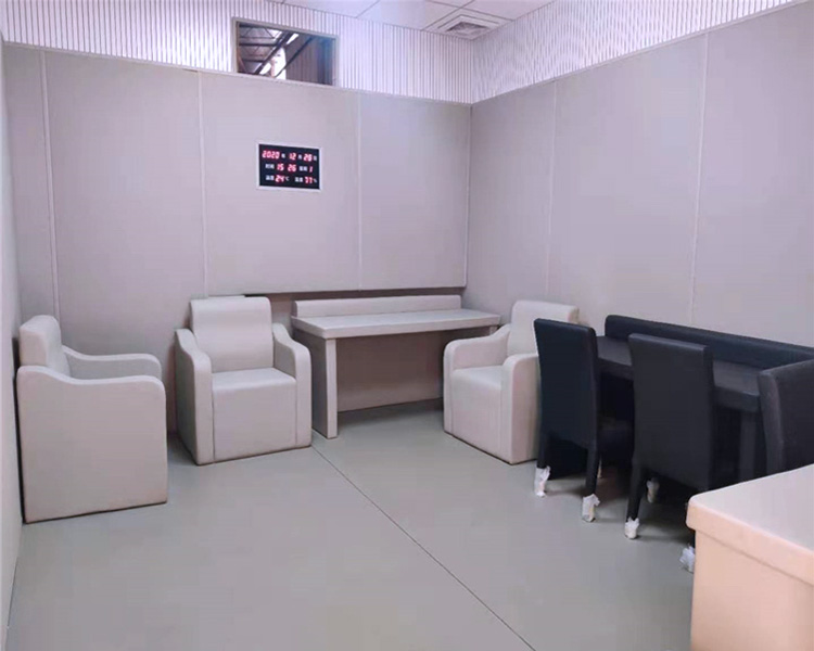 紀(jì)委審訊室防撞軟包墻面常用規(guī)格為1250*2450mm,防撞材料基材為無(wú)膠復(fù)合工藝的聚乙烯發(fā)泡棉,等級(jí)為B1級(jí)阻燃,E0級(jí)環(huán)保。墻面高于2.4米的部分采用阻燃吸音板,達(dá)到室內(nèi)錄音清晰的效果。