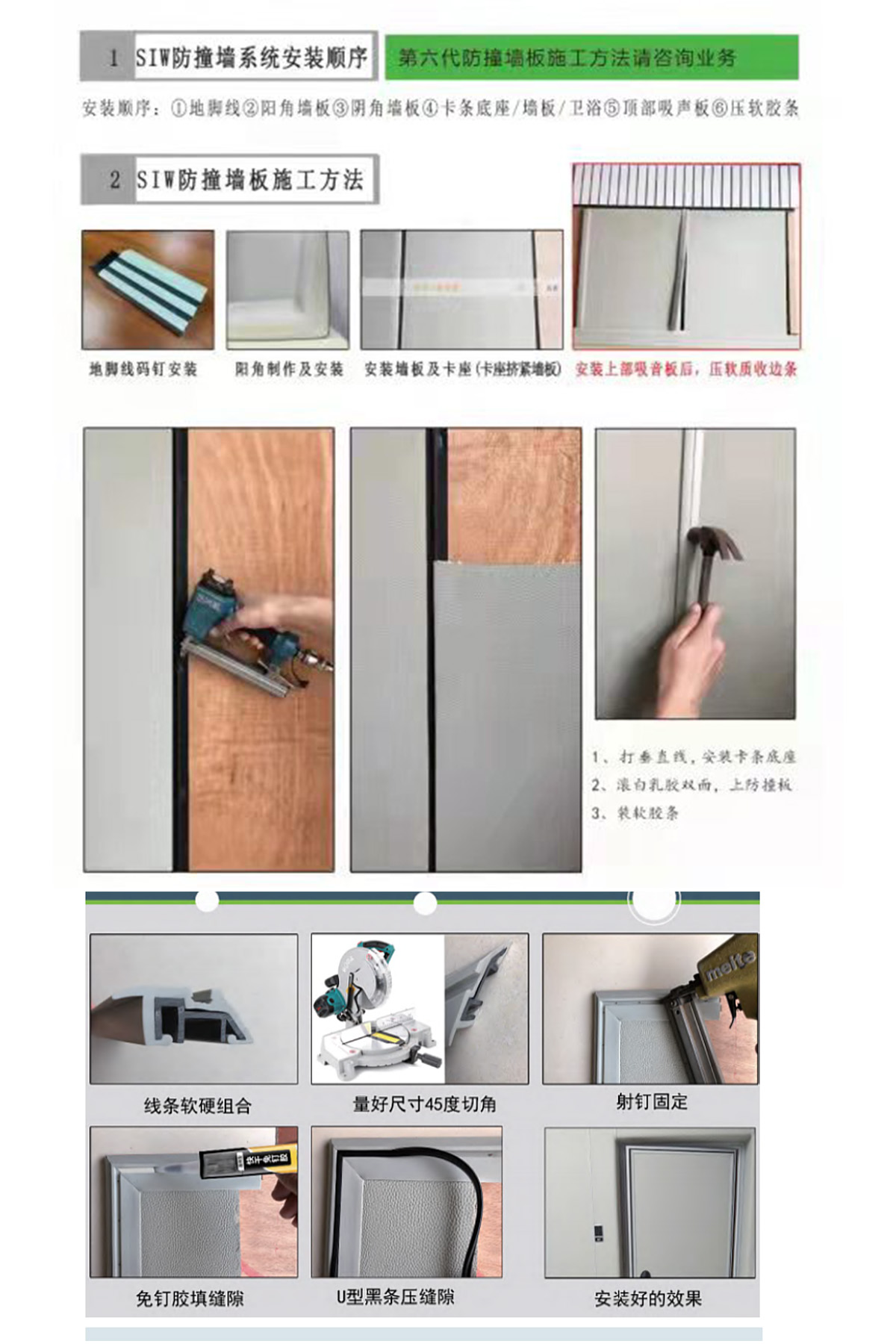 然后要打好木工底板,鋪平底板平面,做水平和垂直,進行標準定線,然后安裝軟包配套設施(地腳線,卡座,),分為底座卡扣和壓邊條,底座是PVC做成的,壓邊條是硅膠做成的。只要在軟包背面刷上一層膠,貼防撞軟包上墻,用手把壓邊條按壓進卡扣即可,也可在壓邊條后背刷膠,使其更加牢固,可防撕拉摳扯。